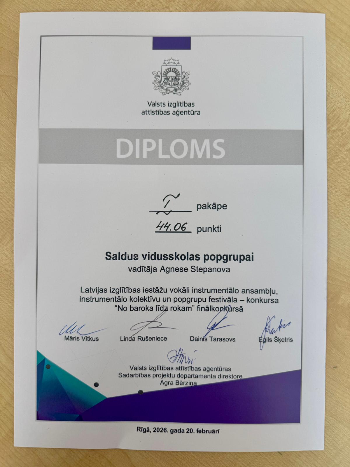 Saldus vidusskolas popgrupa ieguvusi I pakāpes diplomu Latvijas izglītības iestāžu vokāli instrumentālo ansambļu, instrumentālo kolektīvu un popgrupu festivālā-konkursā “No baroka līdz rokam” finālkonkursā.