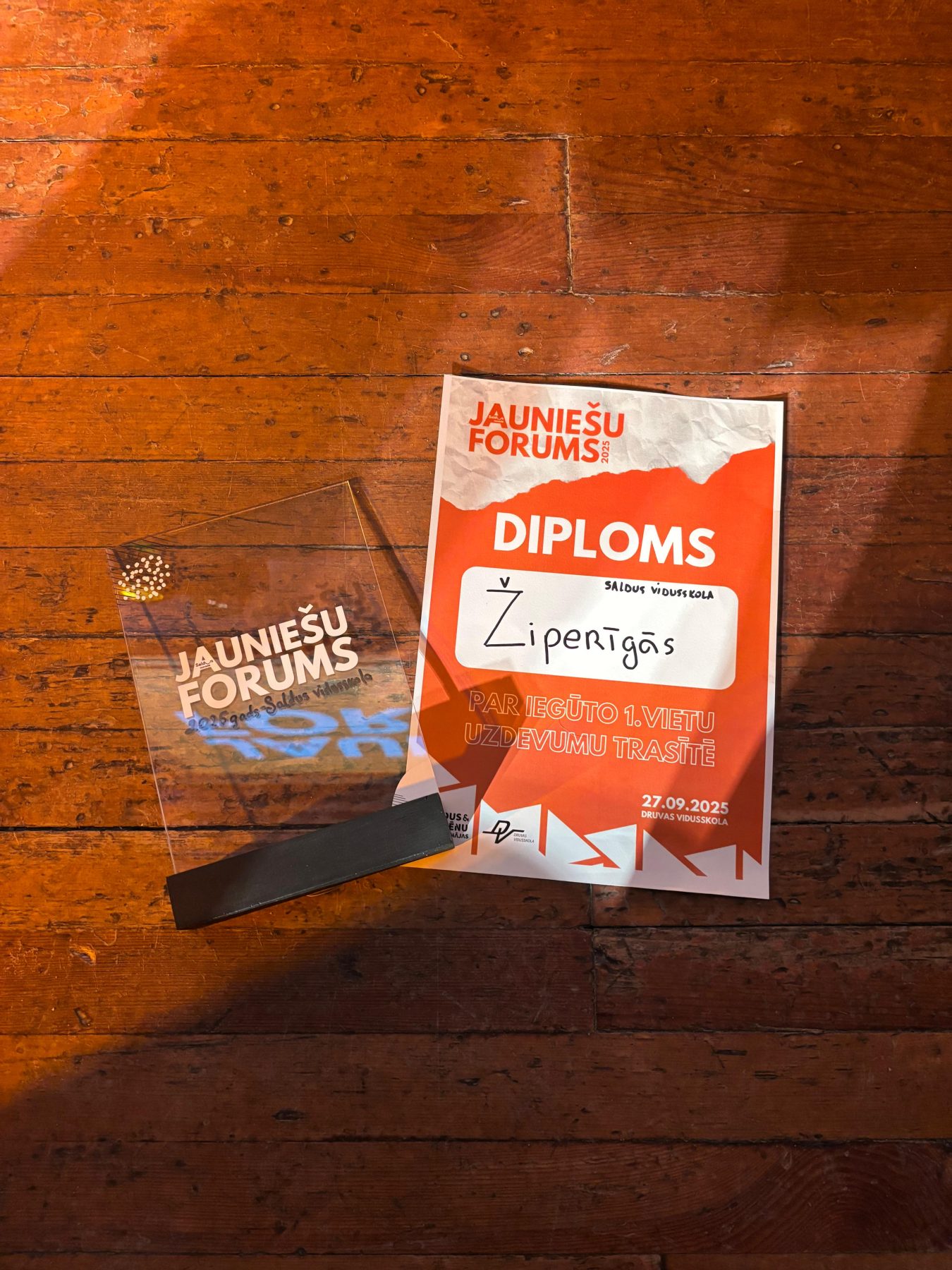 Skolas pašpārvaldes komanda “Žiperīgās”- Katrīna Kazakēviča, Alise Vasiļevska, Annija Vārna un Paula Šteina pēc uzvaras komandu uzdevumu trasītē Jauniešu forumā 2025, parūpējušās, ka 2026. gadā Jauniešu forums notiks Saldus vidusskolā!