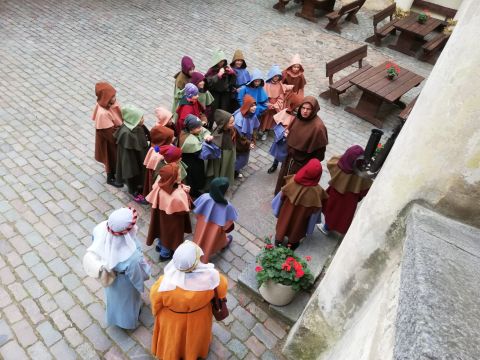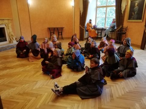 Jaunpils pilī katrs skolnieks kļuva par pilnvērtīgu viduslaiku skolas skolēnu un ietērpās mazā mūciņa tērpā. Gide un viduslaiku personāžs brālis Teodors iepazīstināja ar pili, celtniecības noslēpumiem, galma manierēm. Zēni iepazinās ar bruņinieku ieroču vadīšanas māku. Noslēgumā par godu pils viesiem šāva lielgabals.