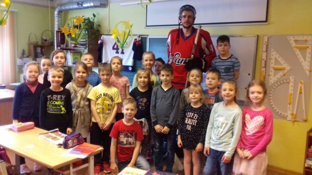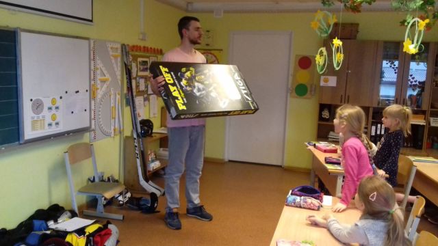 20.martā 1.b klasē viesojās Esteres tētis, HK Lanos uzbrucējs Aigas Ķēpulis. Esteres tētis ieradās ar lielu somu, kurā atrodas viss hokejistam nepieciešamais: sākot ar ūdens pudeli, slidām, cimdiem, elkoņsargiem, kreklu, ķiveri…. beidzot ar kājsargiem. To visu apskatījām, aptaustījām. Klausījāmies interesantā stāstījumā par hokeju. Noslēgumā – saņēmām dāvanu – galda hokeja spēli, par kuru bijām ļoti priecīgi!